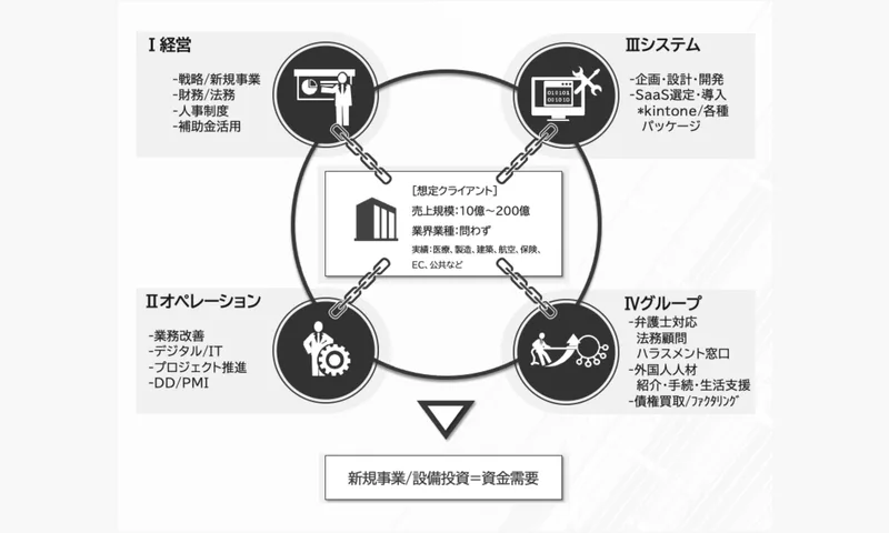 弊社では、経営・オペレーション・システム領域での総合的なサービスで顧客の成長Phaseに寄り添った支援を中長期にわたり行います。
