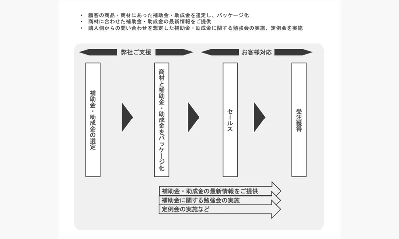 補助金を活用した営業支援を行います。商材にあった補助金・助成金の選定からパッケージ開発までをサポート致します。