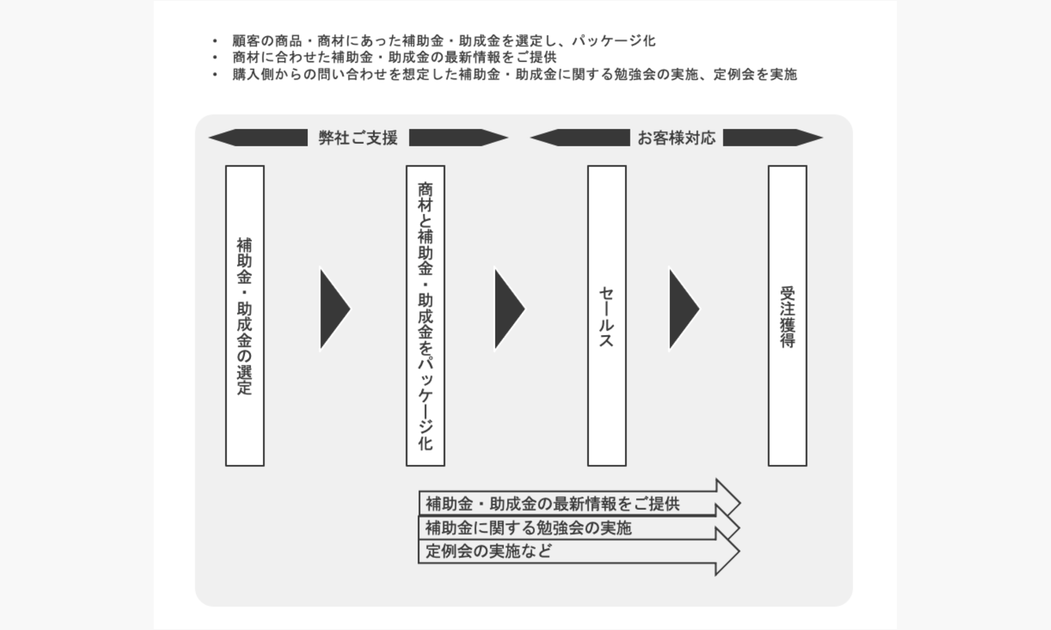 補助金を活用した営業支援を行います。商材にあった補助金・助成金の選定からパッケージ開発までをサポート致します。